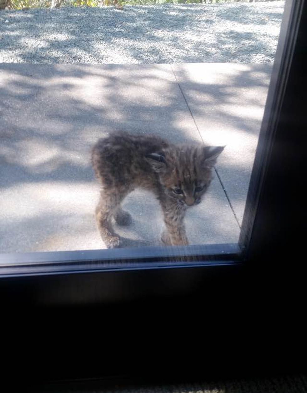 They got a surprise visitor! A little baby bobcat decided to visit a guest house and check it out through the glass door.